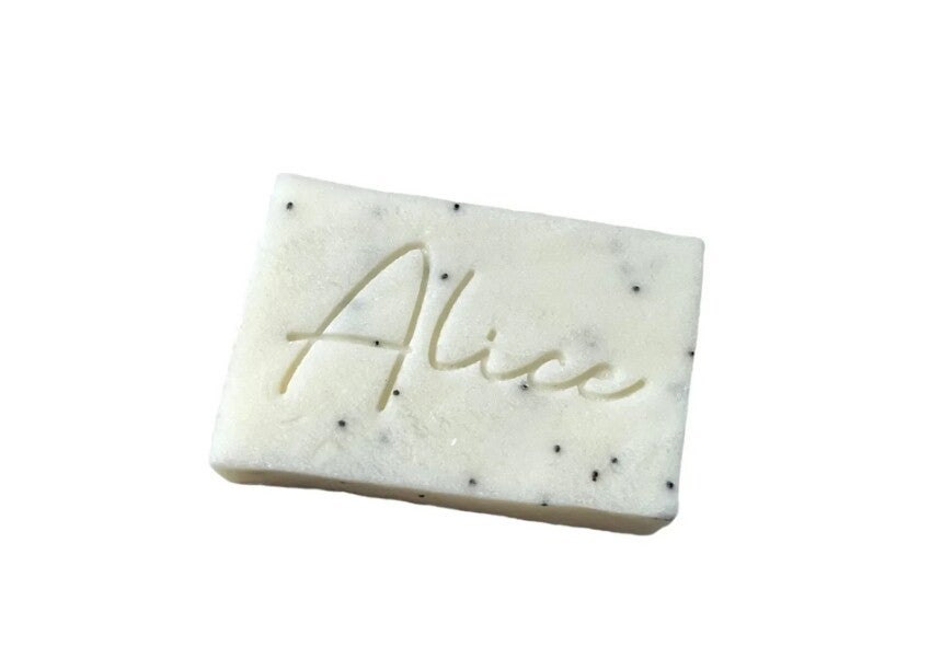 Zeepbar handgesneden met maanzaad inclusief bedrukking